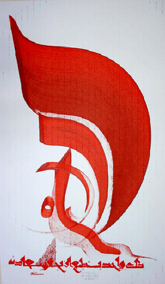 ثم أن معنى الكلمة قد يحاول الحضورفي بعض الأحيان ويزج نفسـه من خلال الشكل. فعندما اخط كلمة هواء أرى الهواء في الحروف. وعندما اخط النار فسـتكون الحروف كاللهب ترتـفع إلى الأعلى. وخلف هذه العناصر سيكون الفضاء المرئي على الورقة خلف الخطوط، وهو النتـيجة الحاصلة من علاقات الحروف فيما بـينها. لذا فان الفضاء هو جديد في كل خط جديد.